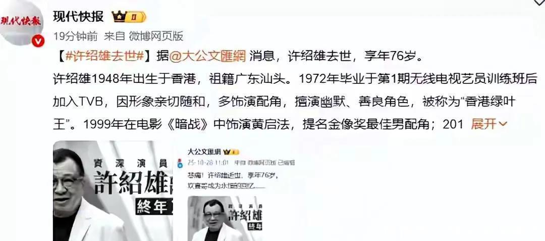 一身才华演绎小人物,半世纪敬业乐业,许绍雄用一生诠释“角色无大小”的真谛。10月28日凌晨,香港资深演员许绍雄因癌症导致器官衰竭安详离世,享年76岁。TVB于今日早晨发表讣闻,确认了这一消息。这位被尊称为“香港绿叶王”的演员,用半个世纪的演艺生涯诠释了“角色无大小”的专业精神。